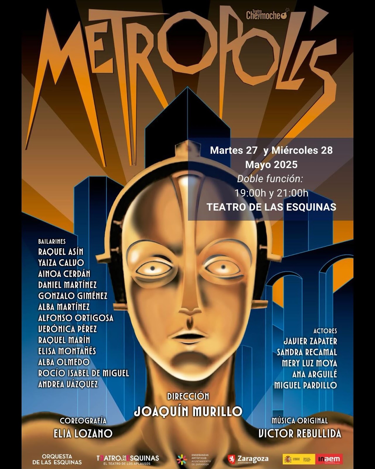 “Metrópolis” se enmarca en el programa de prácticas escénicas para exalumnos de la Escuela Municipal de Teatro de Zaragoza y para alumnos del Conservatorio Municipal Profesional de Danza de Zaragoza. En el proyecto participan cinco actores formados en la Escuela de Teatro y trece bailarines del Conservatorio Profesional de Danza que, acompañados de una partitura original creada exclusivamente para la obra, dan vida a esta maravilla musical, espectacular y única.